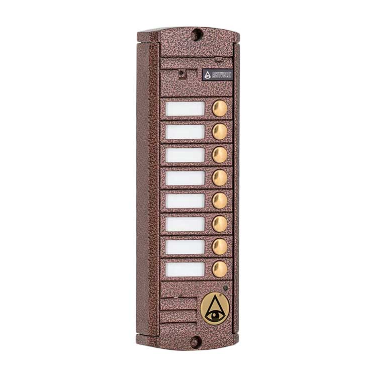 4-х проводная; антивандальная накладная видеопанель 8-ми абонентная; с ИК подветкой до 0,6м, матрица 1/3", 600 ТВл, 12В, угол обзора 75 (гор.) 55 (верт.); рабочий диапазон t -50…+50; 215х70х20 мм, Цветовая гамма: медь, антик