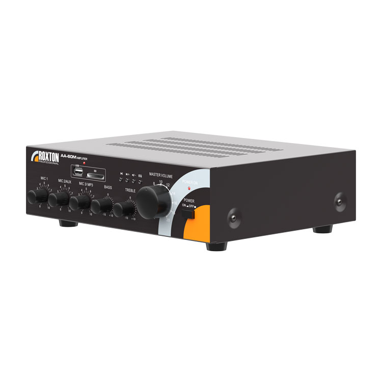 Трансляционный микшер-усилитель ROXTON AA-60M мощностью 60 Вт со встроенным MP3 проигрывателем, поддержкой внешних накопителей это решение начального уровня для построения несложных систем речевого оповещения и музыкальной трансляции. В первую очередь он предназначен для озвучивания помещений небольшой площади. Два линейных и три микрофонных аудиовхода на задней панели дают широкий выбор источников аудиосигнала, а дополнительные низкоомные аудиовыходы позволяют подключать к усилителю акустические системы бытового и профессионального уровней.