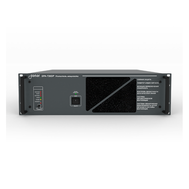 Sonar SPA-720DP - Усилитель мощности трансляционный, выходная мощность 720 Вт, с приоритетным и программным входом, защита от КЗ и перегрузки по току, защита от бросков напряжения, подключение дополнительных модулей SFD-200 (контроль линии) и SFM-300 (контроль питания, вентиляторов), потребление 1890Вт.