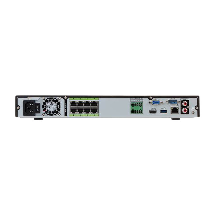 Входящий поток на запись: до 320Мбит/с (до 160Мбит/с при включенных интеллект. функциях); Поддерживаемые форматы сжатия: Н.265+/H.265/H.264+/H.264/MJPEG; Запись: разрешение до 16Мп; HDD: 2 SATA3 до 8Тб; PoE: 8 портов, 1-8 с поддержкой ePoE и EoC; Декодирование: 16кн х 1080Р х 30к/с/4кн х 8Мп х 30к/с; Видеовыходы: 1 HDMI, 1 VGA. Сеть: 1 порт 1000Мбит/с; USB: 1 порт 2.0, 1 порт 3.0; Аудио вх./вых.: 1/1 для дуплексной связи; Тревожные вх./вых.: 4/2; Easy4IP, ONVIF; Моб.ОС: iOS, Android; Питание: AC 220В/15.6Вт, PoE IEEE802.3at/af до 130Вт"