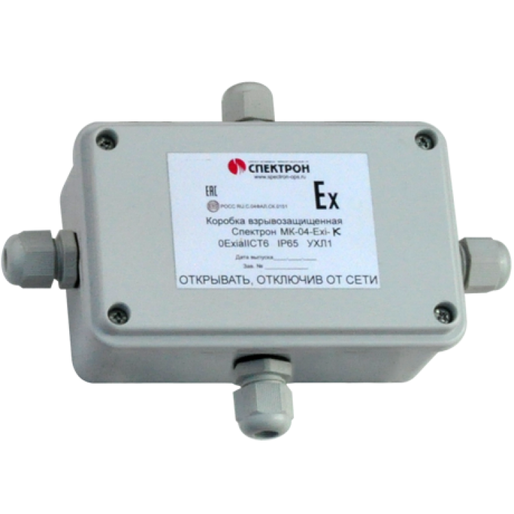 Коробка взрывозащищенная Спектрон МК-04-Exi предназначена для подключения по 2-х или 4-х проводной линии связи извещателей производства ООО «НПО Спектрон».