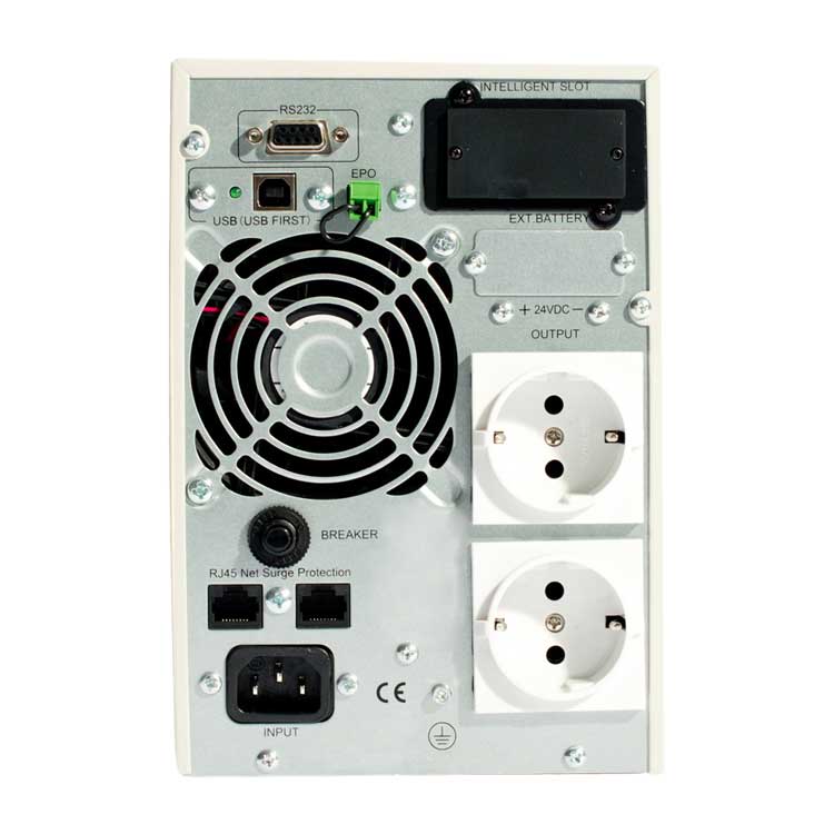 220 В, 1000 ВА (800 Вт), On-Line, синусоидальная форма выходного напряжения, световая и звуковая индикация режимов работы, ЖК дисплей, необходимое количество АКБ для работы — 2 шт. (24 В). Минимальная требуемая ёмкость 17 Ач. Ток заряда АКБ — 6 А. Дистанционный мониторинг по RS 232, USB, порт для платы релейного интерфейса, SNMP-адаптера и др. Функция удаленного аварийного отключения выходного напряжения (EPO). Для безопасной эксплуатации АКБ рекомендуем приобрести металлический бокс «УМБ-3/120» или «АО-2/120 исп.5М»