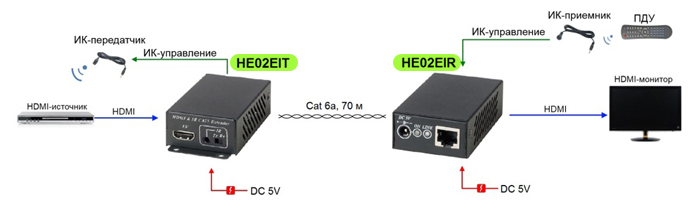 Комплект удлинителя HE02EI, созданного с использованием технологии HDBaseT, состоящий из передатчика и приемника, предназначен для передачи сигнала HDMI и ИК управления по одному кабелю витой пары CAT6a на расстояние до 70м при разрешении 1080p@60Гц, 40м при разрешении 4K2K@30Гц.