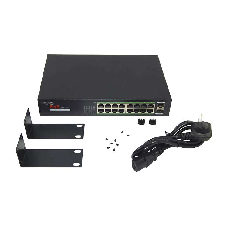 Оснащен шестнадцатью LAN-портами с поддержкой питания РоЕ-устройств до 30Вт на порт и двумя оптическими SFP-портами. Суммарное PoE питание до 200Вт.