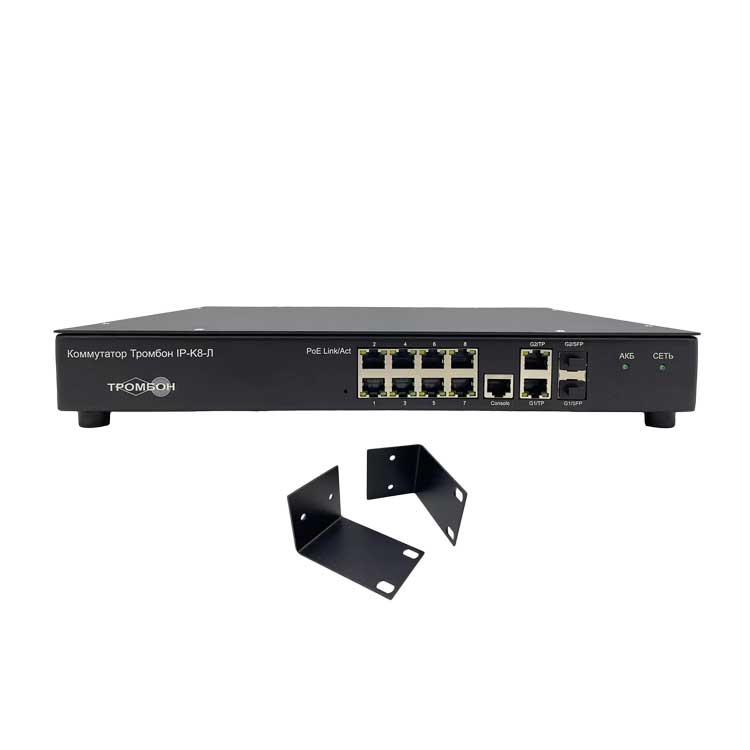 Коммутатор «Тромбон IP-K8-Л» предназначен для приема и передачи данных внутри сети с возможностью подключения внешних резервных АКБ. Совместно с системой звукового вещания, оповещения и управления эвакуацией «Тромбон IP» образует единый комплекс приборов, предназначенных для дистанционного контроля и управления локальными системами оповещения (СОУЭ), построенными на оборудовании «Тромбон».